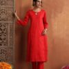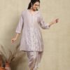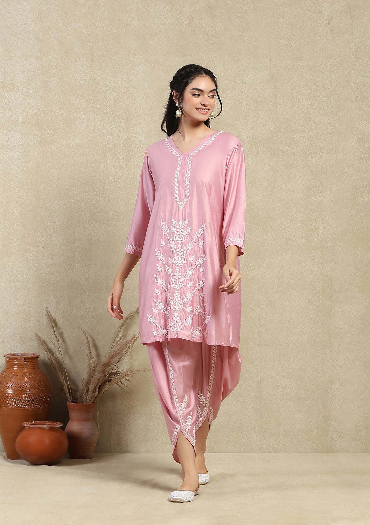 Chanderi Kamdaani Embroidered Solid Women’s 4 PC Long Kurta Set – Pink