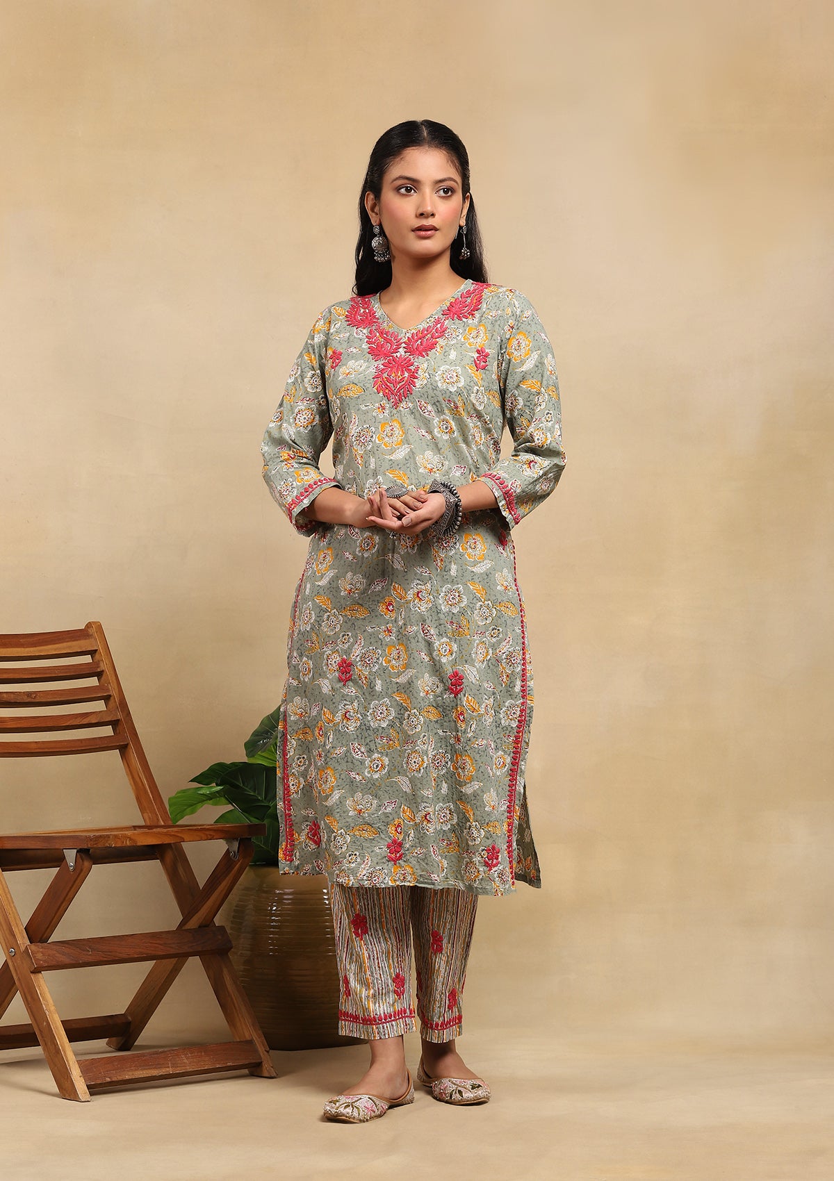 Pantalms Crafts Cotton Aari Embroidered Solid Women’s 3 PC Long Kurta Set – Mustard