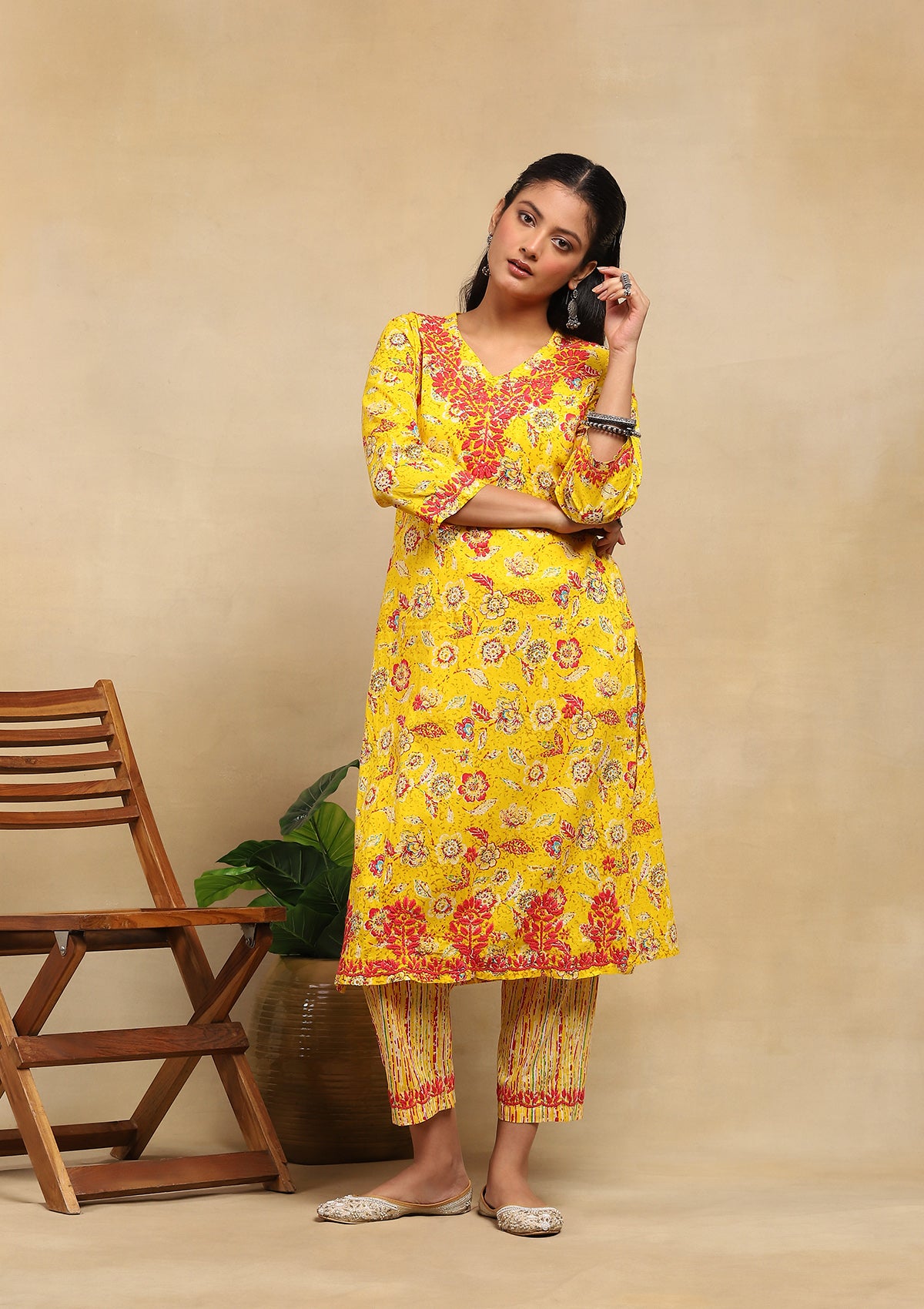 Pantalms Crafts Cotton Aari Embroidered Solid Women’s 3 PC Long Kurta Set – Mustard