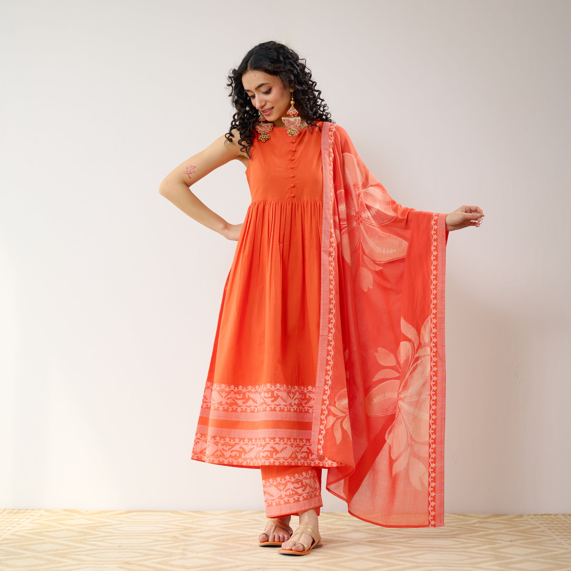 Daisy Cotton Kurta Set with Dupatta – Orange