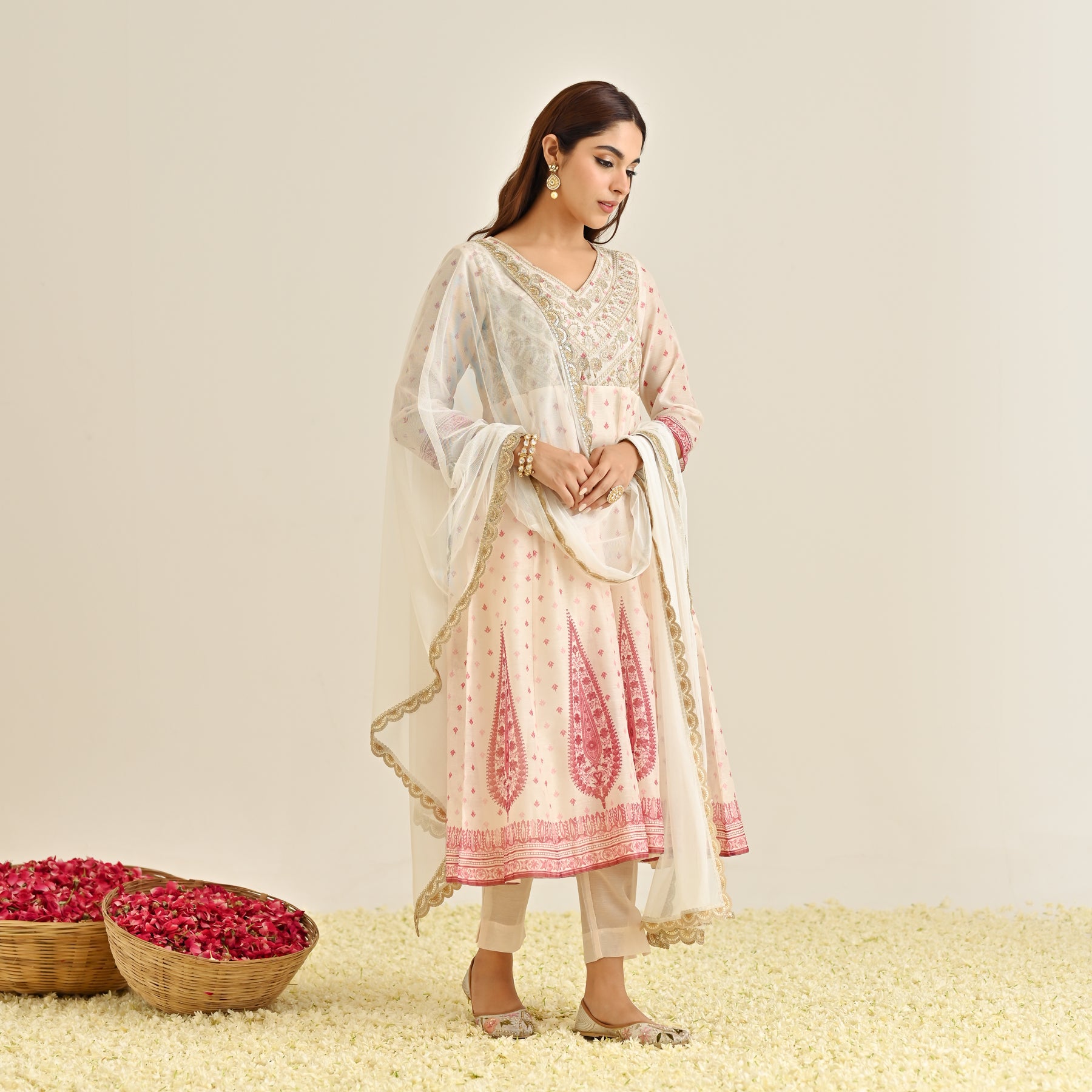 Off White Traditional Anarkali Set with Yoke Embroidery & Dupatta