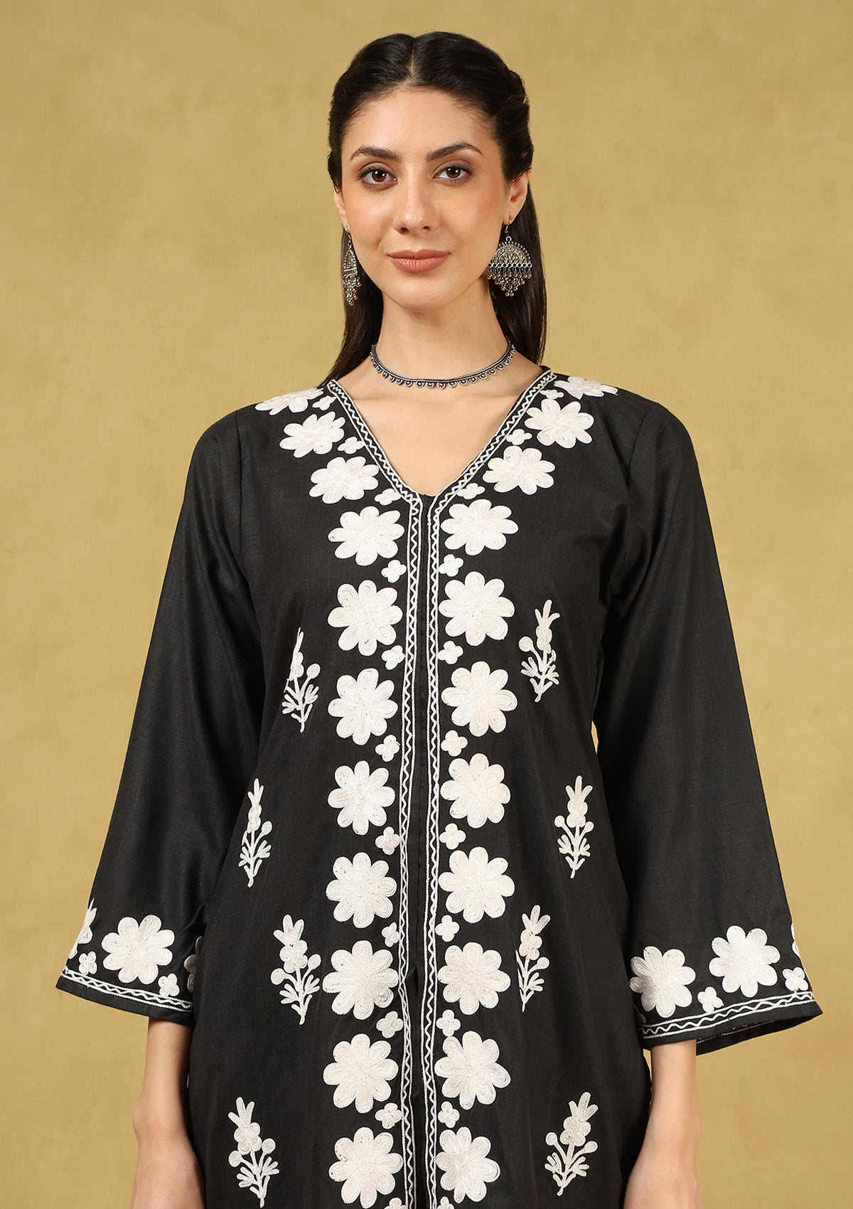 Pantalms Crafts Cotton Aari Embroidered Solid Women’s 2 PC Short Kurta Set – Black