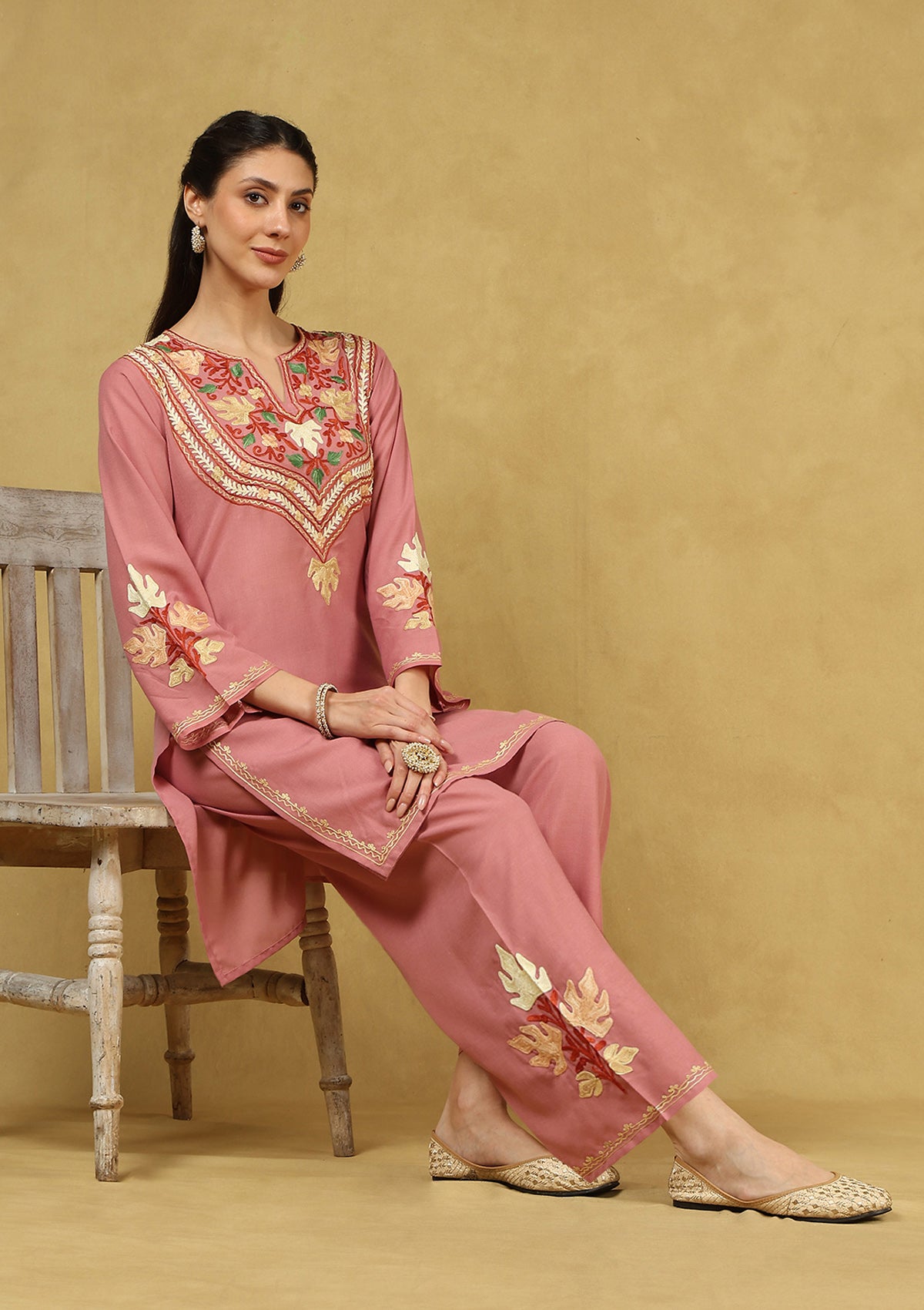 Pantalms Crafts Cotton Aari Embroidered Solid Women’s 3 PC Long Kurta Set – Mustard
