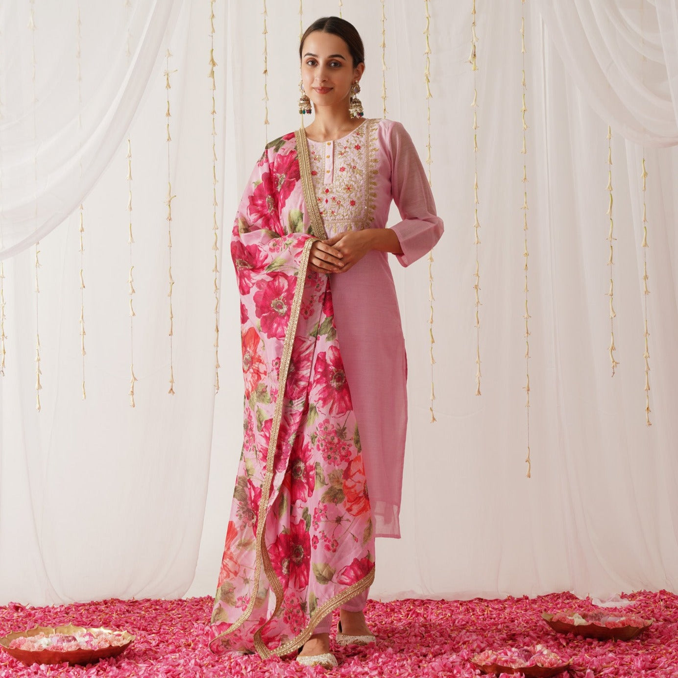 Pink Embroidered Chanderi Kurta Set with Dupatta