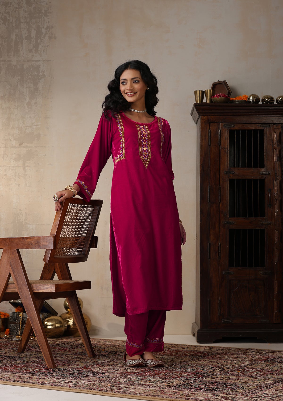 Pantalms Crafts Cotton Aari Embroidered Solid Women’s 3 PC Long Kurta Set – Mustard
